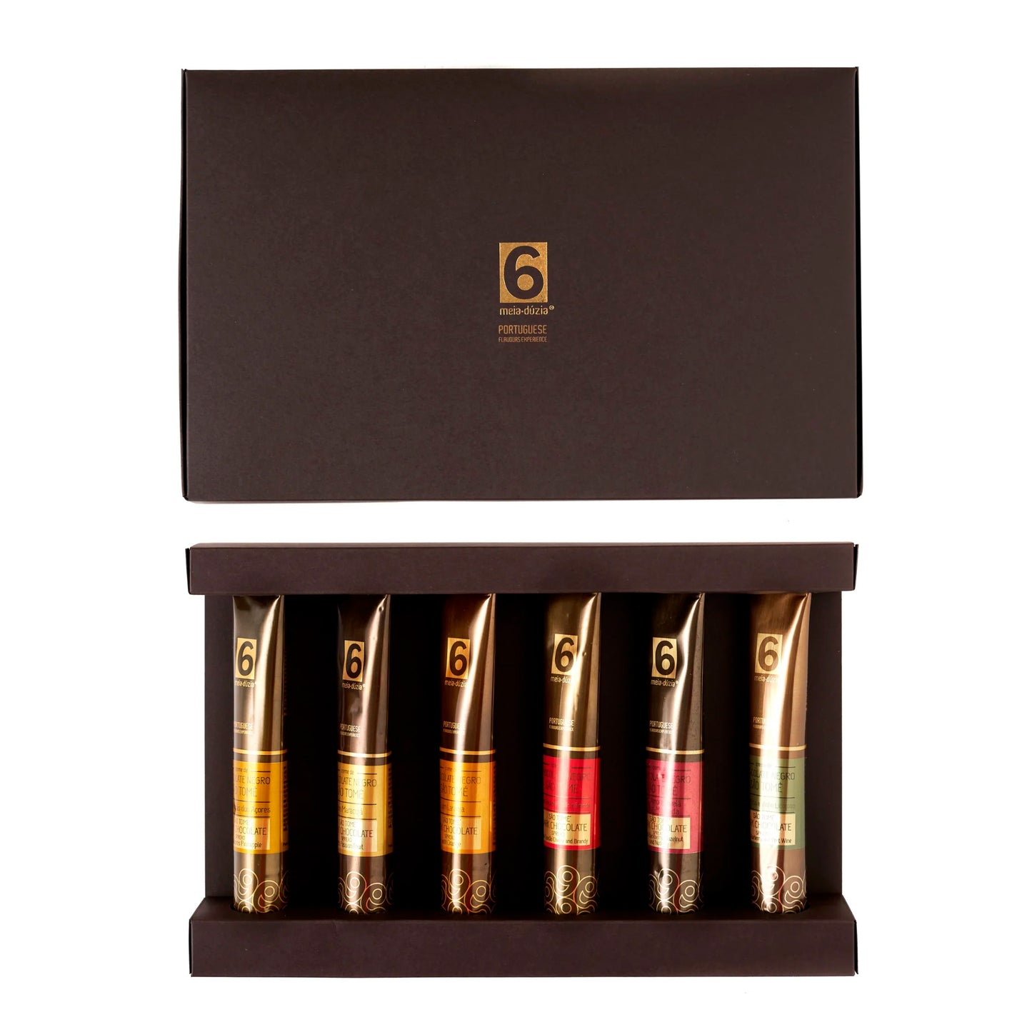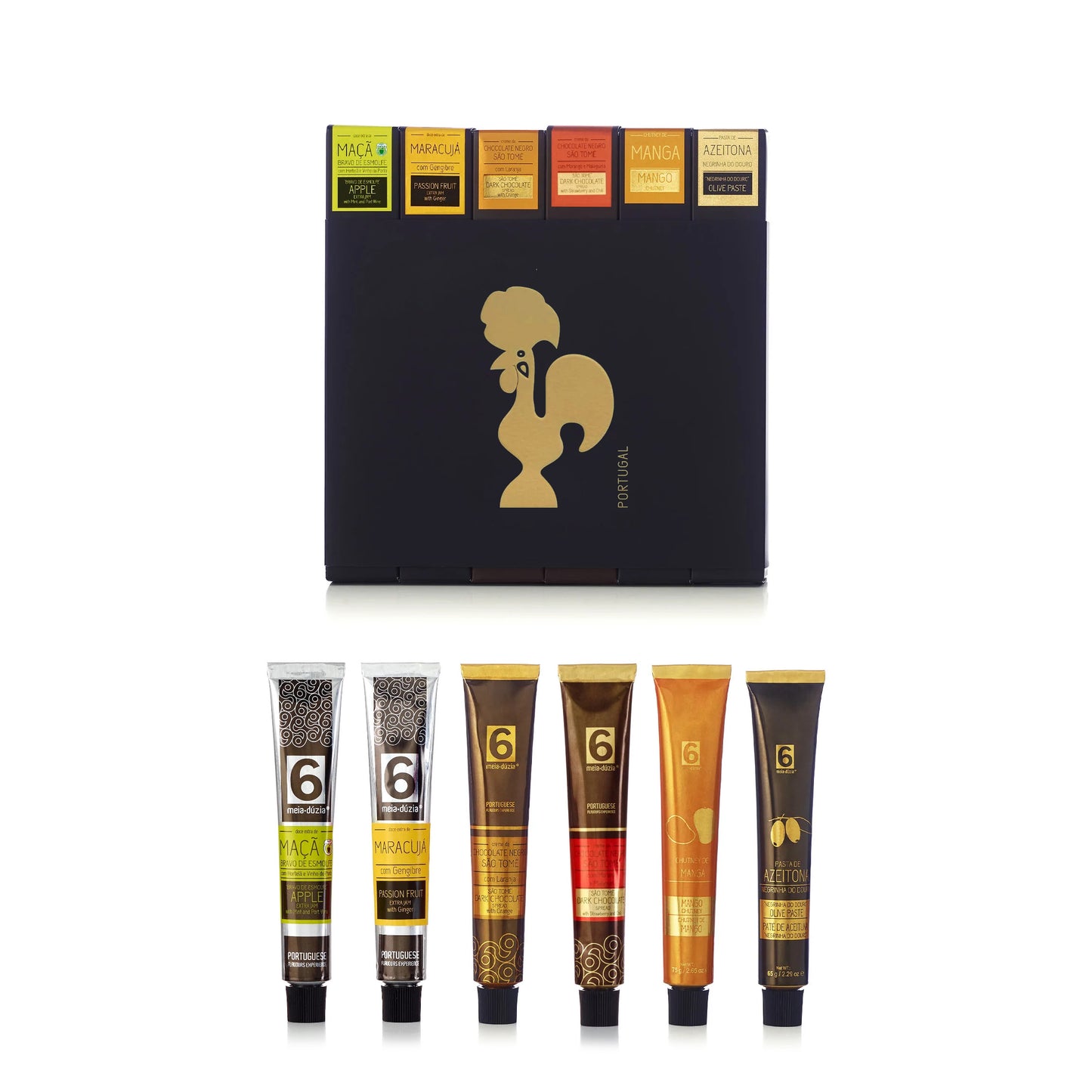 Packs of 6 flavors with gastronomic experiences of fruit jams with Portuguese wines, with aromatic herbs, with spices, chocolate creams with fruits, spreads of olives, chutneys, teas, liqueurs, oils, honey. A true tasting experience of flavors from Portugal, ideal for offering. You can also choose the flavors and create your own custom Packs of 6.