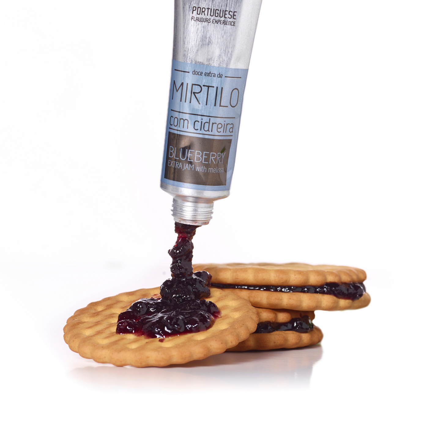 Bisnaga individual de compota de mirtilo com cidreira. Box Experiência: Kit 6 Compotas + Crackers | Prenda para Homem Personalizável. Prenda de Aniversário personalizável com compotas artesanais 100% portuguesas. Sabores de Portugal num presente de gourmet que todos amam receber. meia.dúzia® Sabores de Portugal, prendas gourmet