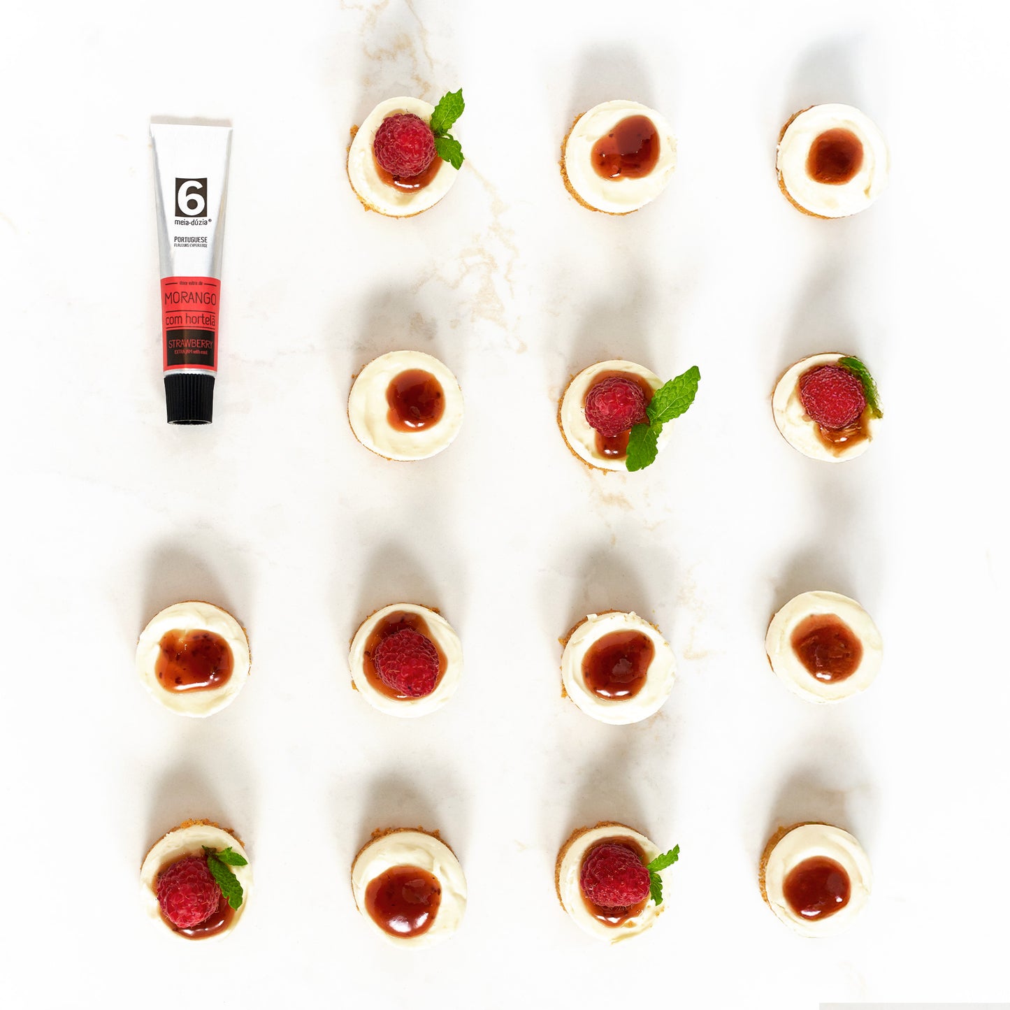 Bisnaga individual de compota de morango com hortelã. Box Experiência: Kit 6 Compotas + Crackers | Prenda para Homem Personalizável. Prenda personalizável com compotas artesanais 100% portuguesas. Sabores de Portugal num presente de aniversário gourmet que todos amam receber. meia.dúzia® Sabores de Portugal, prendas de aniversário gourmet